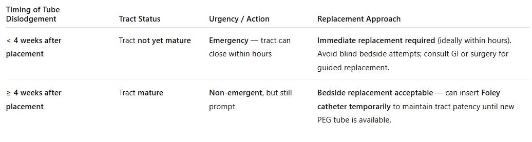 If the tube falls out within the first four weeks before the tract matures, this is an emergency requiring immediate replacement, ideally within hours, as the tract closes rapidly. After four weeks, the tube can be replaced at the bedside with a Foley catheter temporarily until a new PEG tube is placed.