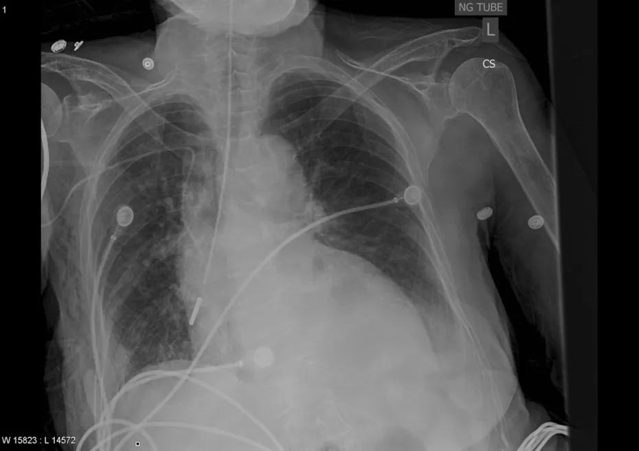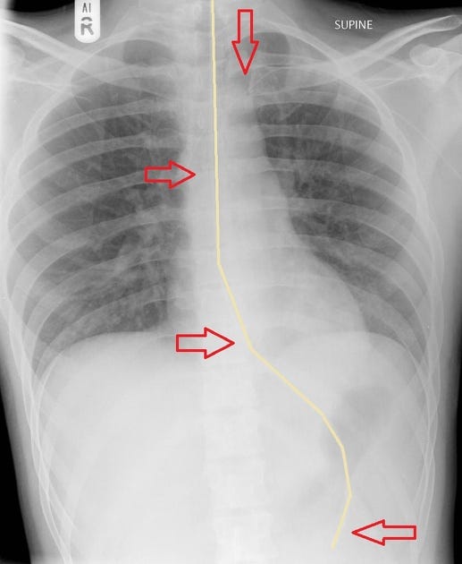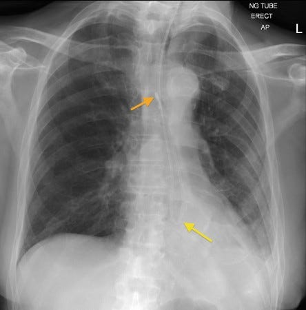 X-ray showing the tube tip in the stomach, below the diaphragm, bisecting the carina.