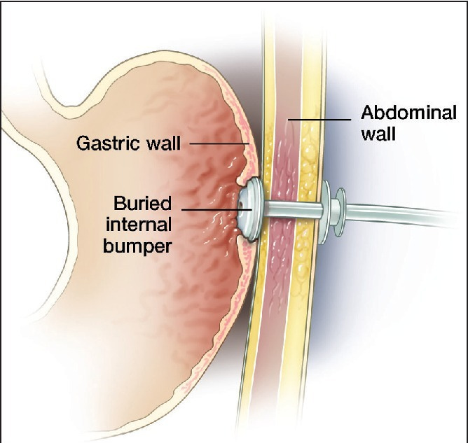 This image shows buried bumper syndrome, where the internal bumper has migrated into the gastric wall, causing pain and feeding intolerance.