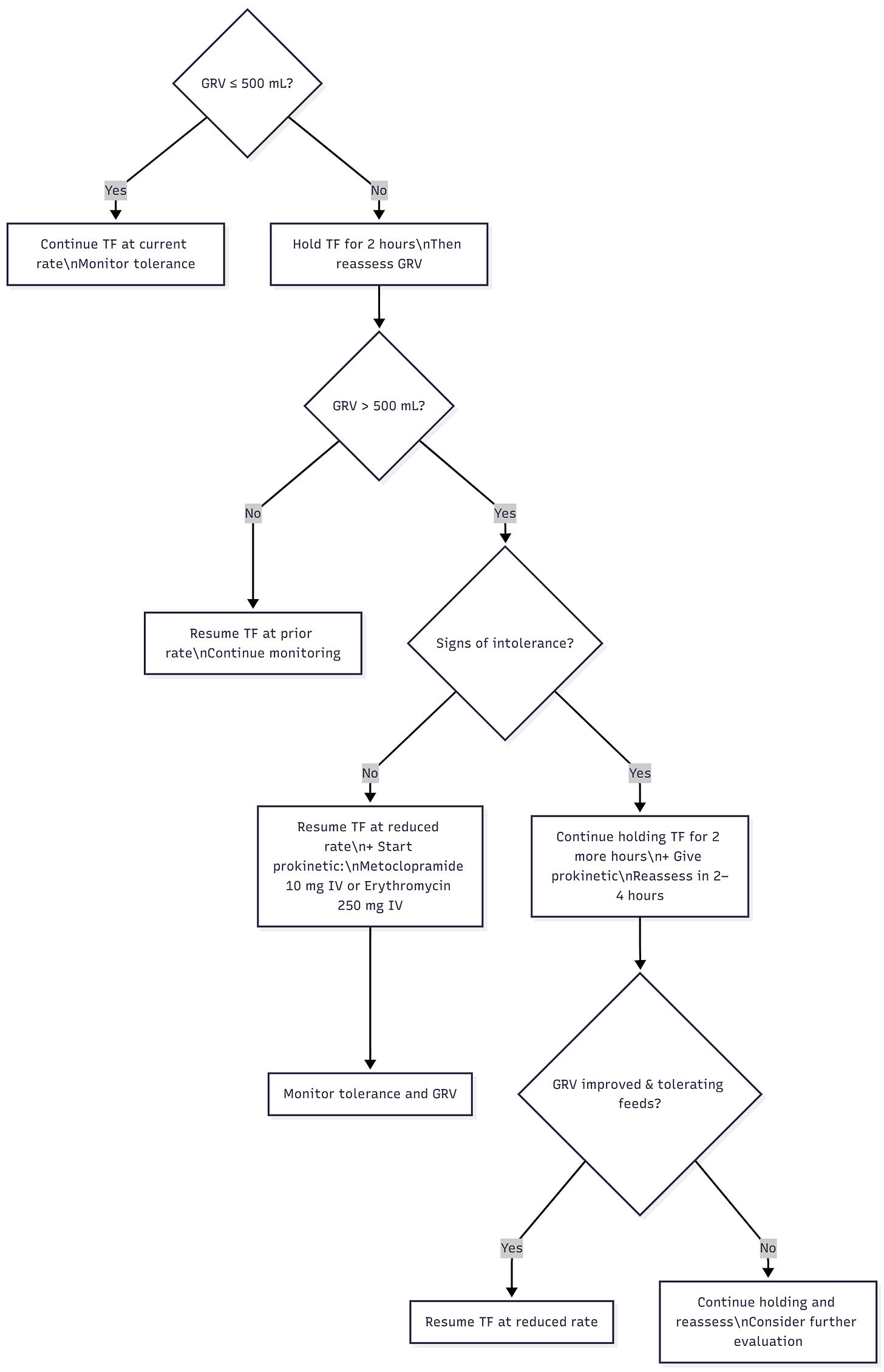 Next, evaluate the patient’s tolerance: any nausea, vomiting, abdominal distension, or diarrhea? These suggest feeding intolerance.
