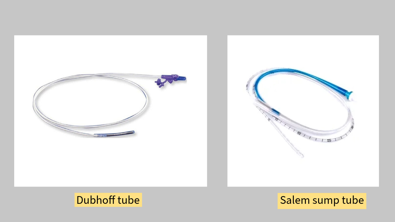 One of the most commonly used NGTs is the Salem sump tubes; these are large-bore tubes used mainly for gastric decompression and suction, featuring a double lumen with a blue vent to prevent mucosal damage.